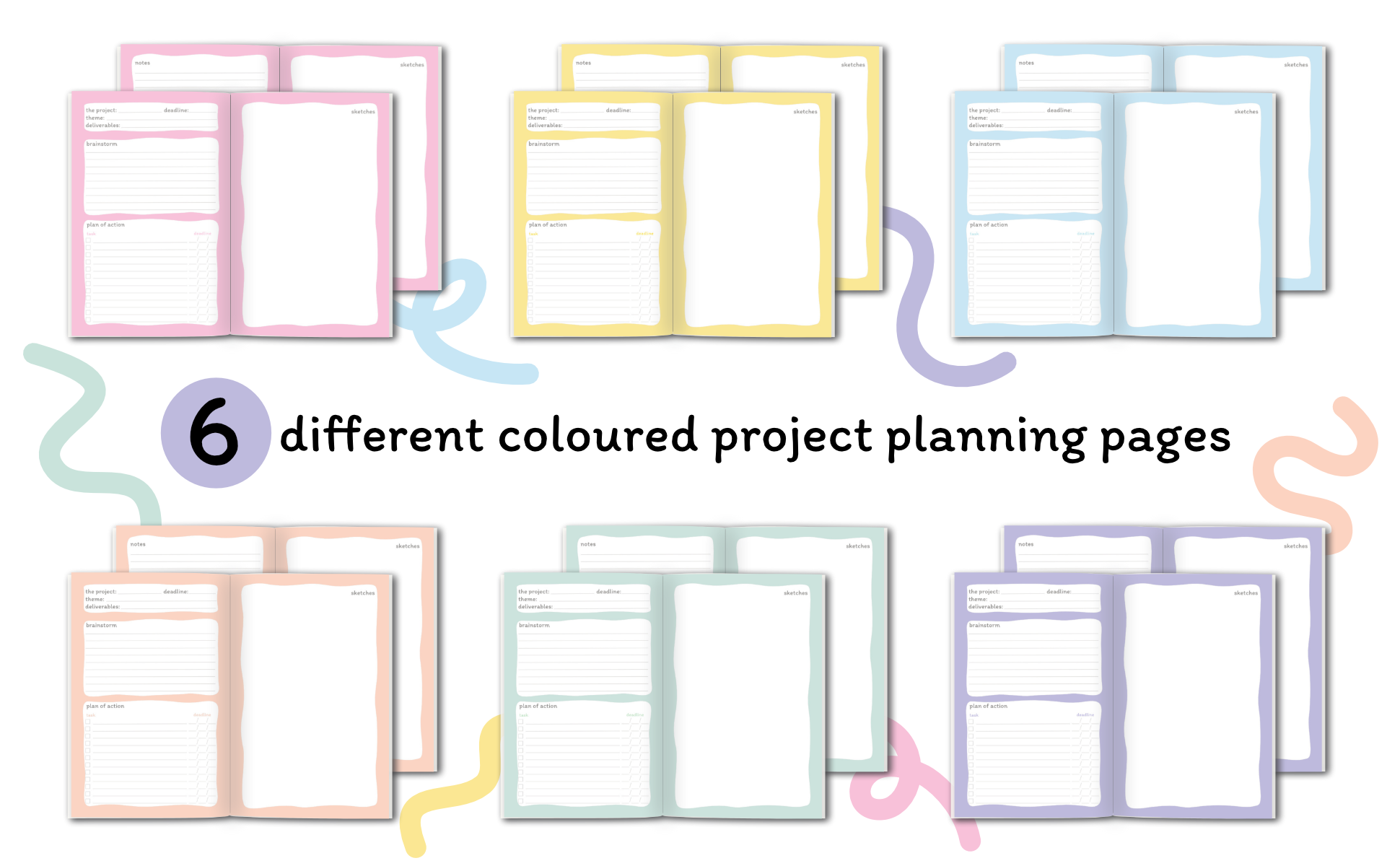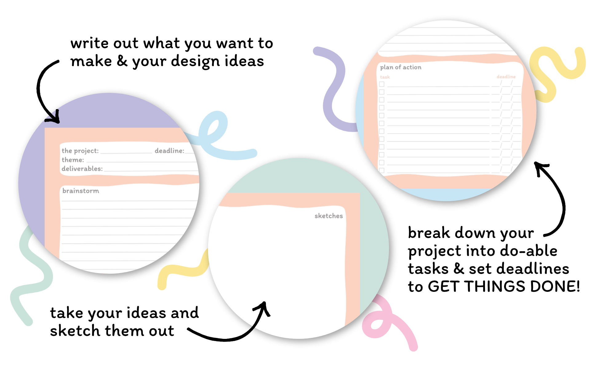 In The Creative Project Planner, there is a plan of action section to write out do-able steps but also put a deadline or date to make sure it gets done. At the beginning of the project planner, I also added a list of design themes to help creatives with ideas for coming up with a possible design.